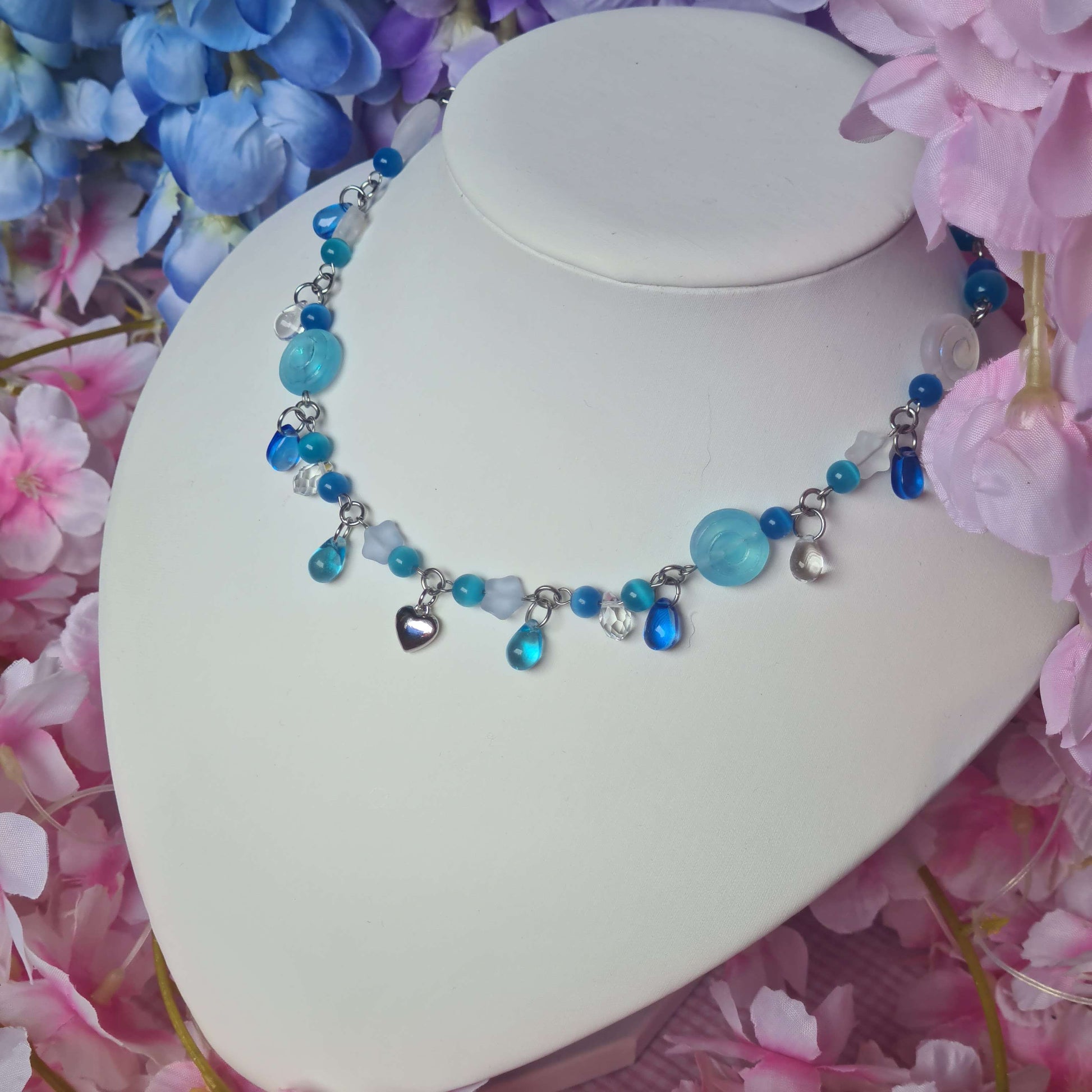 This dreamy necklace features a lot of blue elements, charm and a cute little heart-pendant in the middle ⋆.˚